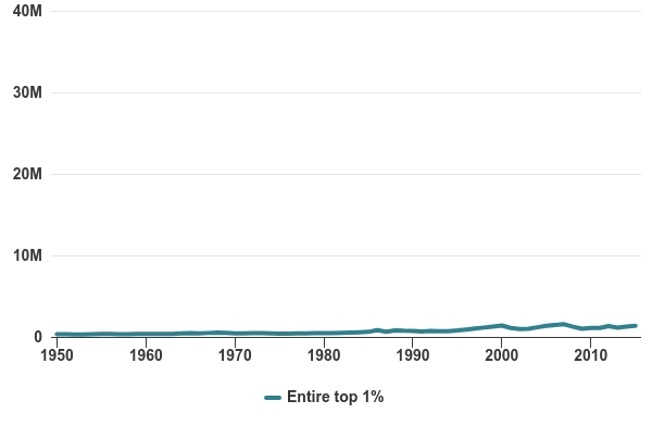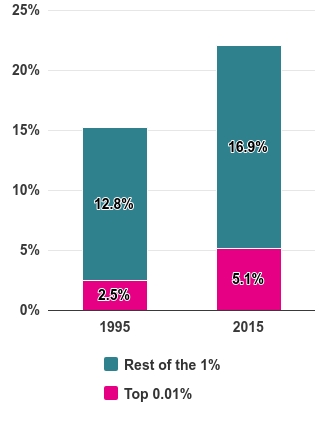 ピケティとサエスのデータによると、1995年から2015年の間に、上位1%の所得シェア(キャピタルゲインを含む)はおよそ15%から22%に上昇した。上位0.1%の所得シェアは6%から11%に上昇し、上位0.01%の所得シェアは2.5%から約5%に上昇した。パーセンテージポイントで見ると、上位1%の所得シェアが最も上昇した。増加率で見ると、0.01%の所得シェアが最も上昇した。