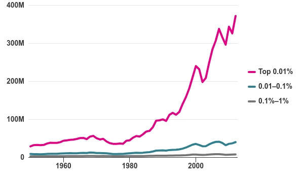 しかし、この小集団が0.01%の所得の4分の1以上を支配する可能性がある。サエズ氏とズクマン氏の計算によると、2012年時点で上位0.01%の富裕層の平均資産は3億7,100万ドルで、総額は6兆ドルということになる。同年、フォーブス 400 のリストに載った個人の推定純資産合計は 1 兆 7,000 億ドルでした。