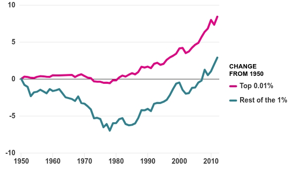 マンキューの論文から約5年が経ち、経済学者たちは0.01%を分析するためのデータをさらに集めてきた。2015年までの35年間で、総所得に占める割合は、残りの1%よりも0.01%の層に急速に増加した。2015年のデータによると、総所得に占める割合は、0.01%では5%、1%では22%に上昇している。カリフォルニア大学バークレー校のエマニュエル・サエス氏とガブリエル ・ズックマン氏は、2012年までの35年間で、米国の総資産に占める0.01%のシェアは4倍の11%になったと主張している。同氏は2012年までの富の計算を行っている。
