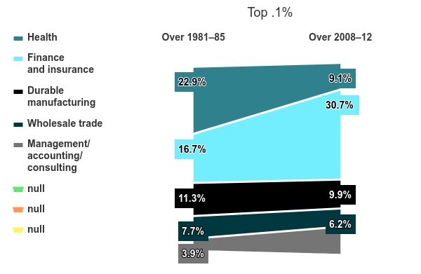 上位0.01%の収入源を突き止めるのはさらに難しいが、金融がこのグループにとって重要なセクターになる可能性があることをいくつかの研究が示している。ウィリアムズ大学のジョン・バキジャ氏、米国財務省のアダム・コール氏、インディアナ大学のブラッドリー・T・ハイム氏は 、所得(キャピタルゲインを含む)の上位0.1%に属する主な納税者の5分の1が金融関係で働いていることを発見した。この研究で使用された最新のデータは、2007 年から 2010 年の金融危機によって状況が一変する前の 2005 年のものです。しかし、2008年から2012年にかけて、0.1%を調査したグヴェネン氏とカプラン氏は、「金融と保険が、最も高額所得者の間で最も大きな割合を占めている産業」であると指摘した。残りの 1% では、ヘルスケアが最も代表的なセクターです。